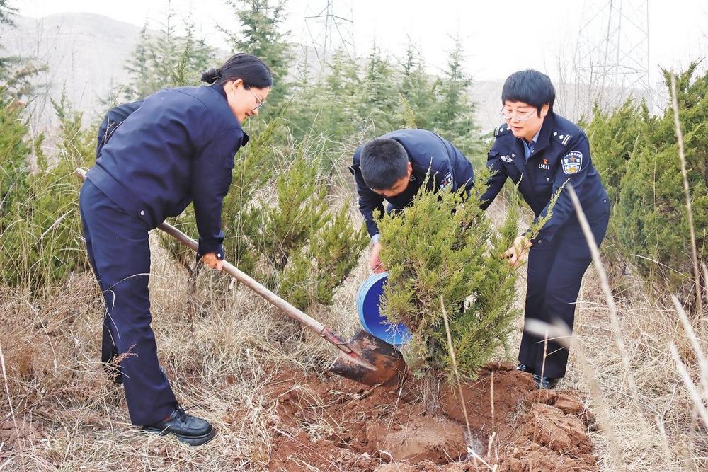 民警植樹現(xiàn)場(chǎng)。近日,隴西縣公安局開展植樹活動(dòng),民警手持鐵鍬、鋤頭,分工協(xié)作,挖坑、栽樹、培土、澆水,在指定區(qū)域種下一棵棵樹苗,為大地增添新綠。 新甘肅·甘肅法治報(bào)通訊員劉恒杰攝
