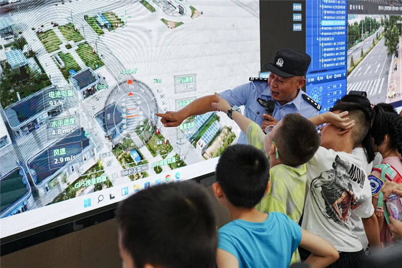 帶著興奮和期待,小朋友們的警營探索之旅開始了!在奧體中心警務(wù)站和警航作戰(zhàn)單元,他們沉浸式參觀了現(xiàn)代警務(wù)工作和警用無人機(jī)的指揮調(diào)度,直觀了解了公安工作的日常場景。另一邊,小朋友們在民警的指導(dǎo)下,一個個親手拿著警用武器裝備零距離“拍照打卡”,“這個好酷!”“看我的!”小朋友們的驚嘆聲此起彼伏。
