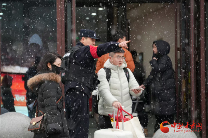 春運(yùn)期間,天水普降大雪,天水南站派出所民警加強(qiáng)警力部署,在站前廣場開展為民服務(wù)