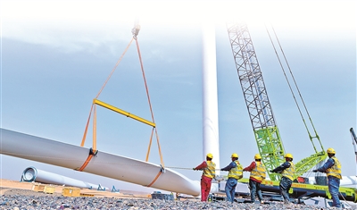 甘肅省高臺(tái)縣境內(nèi)有戈壁荒漠2000多平方公里,近年來憑借風(fēng)光資源優(yōu)勢(shì),發(fā)力新能源產(chǎn)業(yè)賽道。圖為該縣某新能源風(fēng)力發(fā)電項(xiàng)目建設(shè)現(xiàn)場,工作人員正在安裝風(fēng)力發(fā)電機(jī)。新華社發(fā)