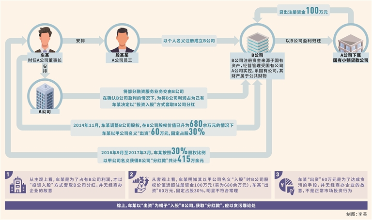 第二,車某的所謂出資行為并非市場投資行為,而是其利用職務(wù)便利獲取本屬于國有公司B公司的確定性預(yù)期收益的犯罪手段。本案中,車某明知其以甲公司名義“入股”時,B公司實際資產(chǎn)高于注冊資金100萬元。經(jīng)查,在車某以甲公司名義“入股”B公司時,B公司實際股權(quán)價值為680余萬元,車某“出資”60萬元占股30%,明顯不符合常理,換言之,車某“出資”60萬元不應(yīng)獲得30%股權(quán)。車某的真實目的是在不承擔(dān)市場風(fēng)險的前提下,利用擔(dān)任A公司董事長的職務(wù)便利,將A公司確定能夠盈利的融資業(yè)務(wù)交給B公司經(jīng)營,并在確認(rèn)B公司能夠盈利的情況下,以“出資”為幌子“入股”B公司,獲取“分紅款”,應(yīng)以貪污罪論處。