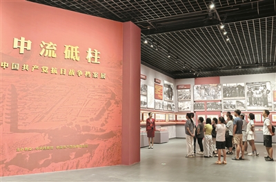 走進(jìn)中國(guó)共產(chǎn)黨歷史展覽館四層專(zhuān)題展廳,首先看到一面紅底金字的大型展板,形似一本翻開(kāi)的書(shū)本。“書(shū)”的正面,“中流砥柱”四個(gè)大字在燈光照射下閃閃發(fā)亮,下方緊跟一行小字“中國(guó)共產(chǎn)黨抗日戰(zhàn)爭(zhēng)檔案展”;側(cè)面,金色字體展示著毛澤東同志《中國(guó)共產(chǎn)黨在民族戰(zhàn)爭(zhēng)中的地位》里的內(nèi)容:“每一個(gè)共產(chǎn)黨員必須發(fā)揮其全部的積極性,英勇堅(jiān)決地走上民族解放戰(zhàn)爭(zhēng)的戰(zhàn)場(chǎng),拿槍口瞄準(zhǔn)日本侵略者。”