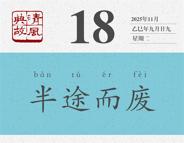 “半途而廢”語(yǔ)出《中庸》:“君子遵道而行,半途而廢,吾弗能已矣。”這句話(huà)是孔子說(shuō)的:“君子遵循正道而行,但往往半途而廢,我絕不會(huì)停止的。”