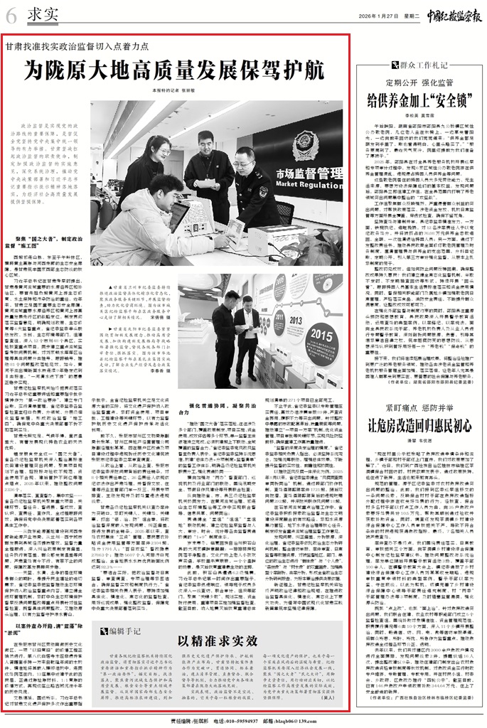 政治監(jiān)督是實現(xiàn)黨的政治路線的重要保障,是督促全黨堅持黨中央集中統(tǒng)一領(lǐng)導(dǎo)的有力舉措。甘肅堅決扛起政治監(jiān)督的職責(zé)使命,制定加強政治監(jiān)督的實施意見,深化系統(tǒng)治理,推動黨中央決策部署和習(xí)近平總書記重要指示批示精神落地落實,為經(jīng)濟社會高質(zhì)量發(fā)展提供堅強保障。