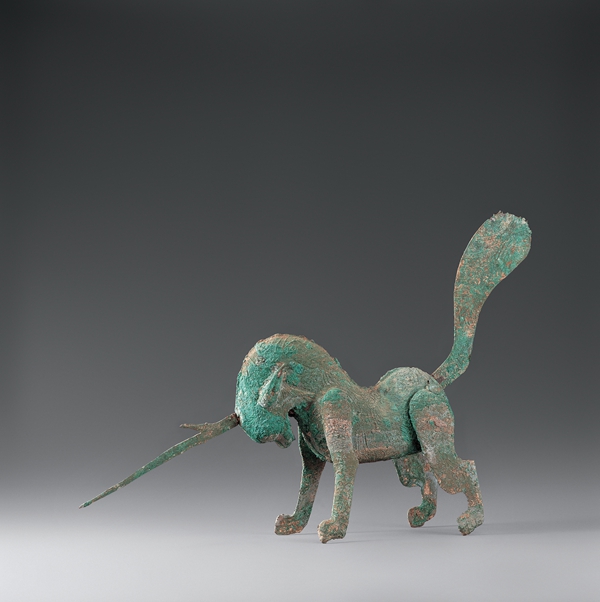 漢代,酒泉市出土,一級(jí)文物。俯首含胸,頸部高聳,頭生獨(dú)角,角向前刺,扁尾高揚(yáng),四足跨張作角斗狀,全身鑄有獸毛紋飾,姿態(tài)威嚴(yán),仿佛隨時(shí)準(zhǔn)備躍起。它是中國(guó)古代文化中能夠分辨善惡曲直的“正義的化身”——獬豸。