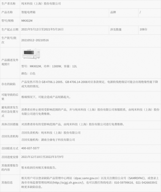 純米科技(上海)股份有限公司召回部分智能電烤箱