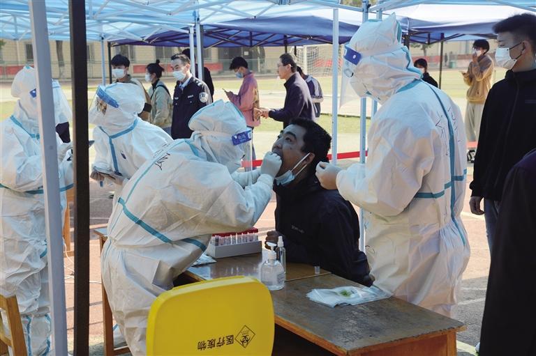 “摘下口罩,抬起頭,嘴張大……”在醫(yī)護人員的引導下,快速完成核酸采樣,整個過程僅需幾十秒,志愿者在旁邊維持秩序并解答相關問題,核酸檢測處處顯關愛。