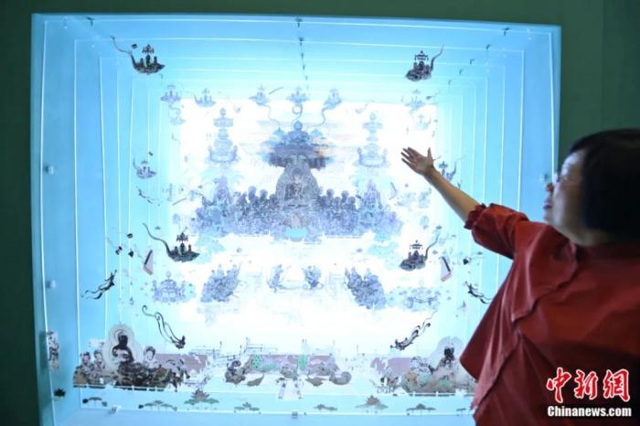 2023年7月14日,孫毅華向中新社記者介紹敦煌壁畫(huà)中的建筑形象。李亞龍 攝