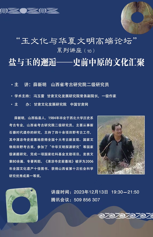 12月13日晚,山西省考古研究院二級研究員薛新明在線做了題為《玉器所見齊家文化時期甘青地區(qū)與關(guān)中地區(qū)的交流互動》的學術(shù)報告。這是甘肅文化發(fā)展研究院主辦的“玉文化與華夏文明高端論壇”系列講作活動第10講,也是今年的壓軸之講。