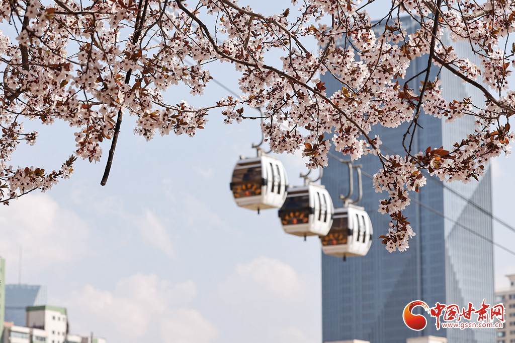 3月31日,在蘭州市城關(guān)區(qū)黃河風(fēng)情線(xiàn),市民、游客乘坐纜車(chē)賞花游覽。