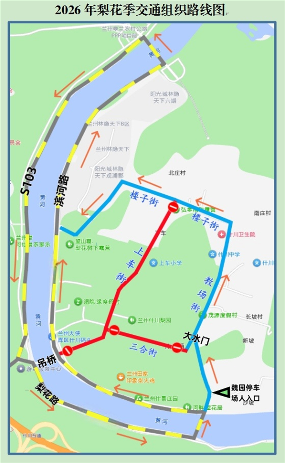 什川古梨園百年古梨樹(shù)枝繁葉茂,春日梨花滿(mǎn)枝、如雪似霞,每年梨花節(jié)都是市民游客春日打卡的熱門(mén)目的地。為應(yīng)對(duì)節(jié)日期間的車(chē)流高峰,皋蘭縣政府聯(lián)合縣公安局及各相關(guān)部門(mén),制定了科學(xué)的交通組織方案,并繪制了2026年梨花季交通組織路線(xiàn)圖,明確了景區(qū)內(nèi)外循環(huán)通行規(guī)則與停車(chē)區(qū)域。