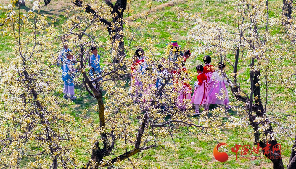 身著絢麗服飾的孩童在梨花樹下玩耍,衣袂飄飄,盡顯春日踏青的悠然意趣