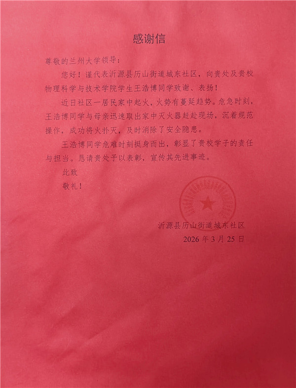近日,一封社區(qū)致蘭州大學(xué)的感謝信,讓該校物理科學(xué)與技術(shù)學(xué)院學(xué)生王浩博的暖心事跡走進公眾視野。2026年3月3日,元宵夜,放假居家的他偶遇居民樓突發(fā)火情,憑借校園培訓(xùn)習(xí)得的消防技能,沉著處置初起火災(zāi)、轉(zhuǎn)移危險物品,以本能之舉守護鄰里安全,彰顯新時代青年的責(zé)任與擔(dān)當(dāng)。