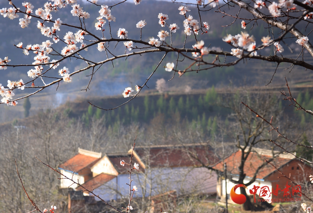 春風(fēng)吹醒山野,粉白杏花綴滿枝椏,錯(cuò)落村舍掩映在花影山色間,一派悠然的鄉(xiāng)村春日景致