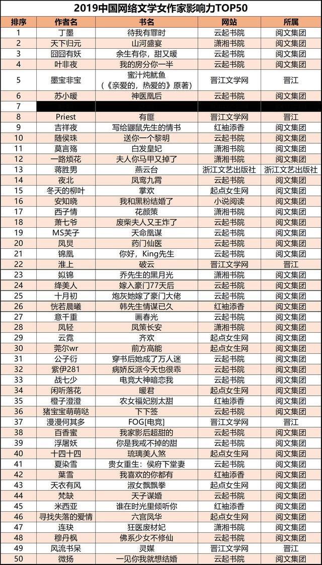 中國青年報客戶端訊(中青報·中青網(wǎng)記者 沈杰群)日前,《2019年中國網(wǎng)絡(luò)作家影響力榜》正式發(fā)布,通過對作家的作品影響力、平臺影響力及新媒體影響力多維度的分析與論證,綜合衡量出作家影響力,評選出國內(nèi)最具影響力男作家TOP50及女作家TOP50。