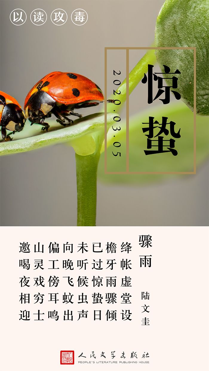 “萬卷古今消永晝,一窗昏曉送流年”,在抗疫重于踏青、防毒甚于訪友的當(dāng)下,一書在手物我兩忘的閱讀就是宅家攻毒的法寶。“我讀,故我在”,自新華網(wǎng)悅讀頻道在其元宵節(jié)海報上首倡“以讀攻毒”至今,“以讀攻毒”已成文化界熱詞。今日驚蟄,萬物復(fù)蘇,為給居家久蟄的人們鼓勁祈福,展現(xiàn)新華網(wǎng)悅讀推廣人聯(lián)盟與全國人民一道守望相助、共克時艱,新華網(wǎng)客戶端、新華網(wǎng)悅讀頻道、新華網(wǎng)公益頻道特舉辦“以讀攻毒同題公益海報聯(lián)展”活動,以此祈愿國泰民安、山河無恙!祈愿每一位讀者讀有所獲、安康順意!