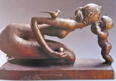最后的廳,是一批中外馳名的雕塑代表作——從嬌小稚拙掌中把玩的小品到體量龐大高聳入云的巨構(gòu),無(wú)論隨形寫意、裝飾寫實(shí),美林都在策劃、構(gòu)成、調(diào)整、定型的繁復(fù)過(guò)程中,顯示出扎實(shí)的藝術(shù)功力與非凡的浪漫色彩。其中,龍、虎、馬、牛等動(dòng)物系列,不僅延續(xù)了繪畫中獨(dú)有的造型風(fēng)格,而且更凝重渾厚,更富裝飾情趣。與眾不同人見人愛(ài)的母子系列中,不論是精心呵護(hù)襁褓嬰兒的母親,匍匐草地引領(lǐng)學(xué)步的母親,牽手寶寶步入校園的母親,造型、肢體的夸張之奇變形之巧,感官、神態(tài)的風(fēng)韻依依顧盼有情,讓人駐足良久再三流連……