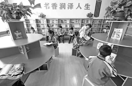 圖為5月12日,在吹麻灘小學(xué)圖書(shū)室,董彩云(后排右二)和正在閱讀的學(xué)生交流。