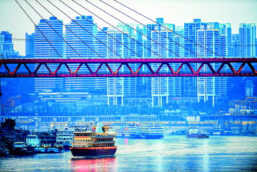 盡管長(zhǎng)江索道單向車(chē)程只有3分鐘,但游客眼里的風(fēng)景卻別有風(fēng)味。從北岸到南岸,雖說(shuō)穿行于鬧市,卻如同在兩山之間悠蕩。先是遠(yuǎn)處的高樓密密麻麻地盡收眼底,腳下的老建筑也歷歷在目。快到江邊時(shí),有一片黃墻灰瓦的古建筑格外醒目,這就是湖廣會(huì)館。緊接著,車(chē)廂開(kāi)始凌越長(zhǎng)江,腳下滾滾江水一路向東。江中有一座大橋,名曰東水門(mén)大橋,2014年3月建成,橋上汽車(chē)如過(guò)江之鯽,橋下軌道列車(chē)瀟灑穿行。接近南岸時(shí),風(fēng)情萬(wàn)種的南濱路一覽無(wú)余。此后,又是一段充滿(mǎn)懷舊味道的老建筑。當(dāng)你還沒(méi)來(lái)得及回味時(shí),鈴聲驟然響起——到站了。