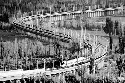 伴隨改革開放大潮,中國發(fā)展日新月異,高鐵、快遞、“天眼”望遠(yuǎn)鏡、粵港澳大橋等新事物都被詩人們?nèi)谌朐娦小D為行駛中的蘭新高鐵列車。新華社發(fā)(蔡增樂攝)