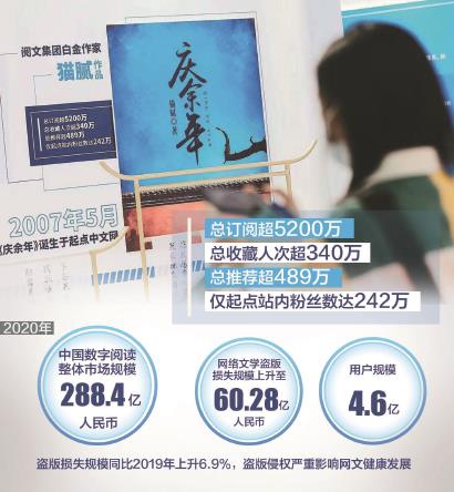 有數(shù)據(jù)顯示,2020年中國網(wǎng)絡(luò)文學(xué)市場規(guī)模為288.4億元,網(wǎng)絡(luò)文學(xué)通過IP全版權(quán)運營間接或直接影響了動漫、音樂、影視、游戲等合計約2531億元的市場,對數(shù)字文化產(chǎn)業(yè)的影響范圍超過40%。但令人痛心的是,2020年中國網(wǎng)絡(luò)文學(xué)盜版損失規(guī)模達60.28億元,同比上升6.9%。