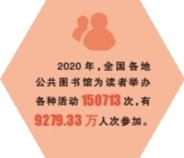 數(shù)據(jù)顯示,全國各級(jí)公共圖書館普遍開展講座、展覽、閱讀指導(dǎo)、讀書交流、演講誦讀等活動(dòng)。僅2020年,各地公共圖書館就為讀者舉辦各種活動(dòng)150713次,有9279.33萬人次參加。