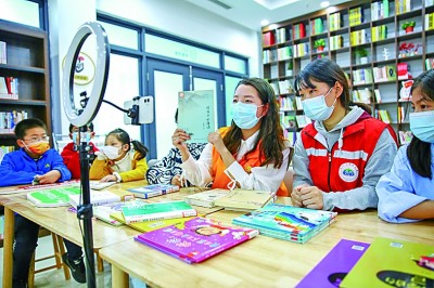 在江蘇如皋市如城街道顧莊社區(qū)農(nóng)家書(shū)屋內(nèi),志愿者通過(guò)網(wǎng)絡(luò)平臺(tái)為學(xué)生推薦好書(shū)。徐慧攝/光明圖片