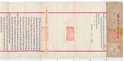 來(lái)自鎮(zhèn)江市圖書館的《封贈(zèng)文藻父母誥命》是清廷頒給張家口左翼正白旗滿洲四品銜驍騎校文藻父母的誥命,內(nèi)容為封賜文藻之父賡吉圖為昭武都尉,其母額哲特氏為恭人。這幅圣旨由黃、赤、紫三色錦織就,卷頭和卷尾分別織有漢、滿文“奉天誥命”4字,字兩旁有升龍和降龍盤繞紋樣。此誥命的制誥時(shí)間為光緒三十四年(1908年)十一月初九,當(dāng)時(shí)光緒帝已經(jīng)去世,宣統(tǒng)帝于此日即位。