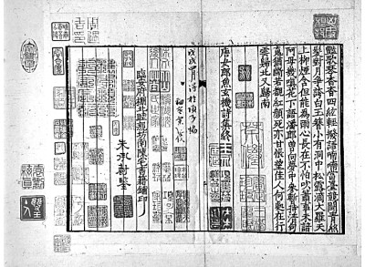 范景中先生曾見(jiàn)過(guò)謝蘭墀擺印本《唐宋文醇》,是書“正文用墨印,墨點(diǎn)用朱印,御評(píng)用黃印,朱子評(píng)用朱印,各家評(píng)用藍(lán)印,實(shí)為四色套印”。至于《唐宋詩(shī)醇》,范先生認(rèn)為是木活字五色套印。其主要依據(jù)是《詩(shī)醇》凡例云:“評(píng)語(yǔ)悉準(zhǔn)《唐宋文醇》之例,色別書之,但其中有援據(jù)正史雜說(shuō)用資考訂疏解者,與古今人評(píng)詩(shī)之語(yǔ)義各有在,《文醇》未經(jīng)區(qū)別,今于藍(lán)筆之外,另作綠筆書,以便閱者,燦若列眉。”按照凡例的說(shuō)法,《詩(shī)醇》在《文醇》朱、墨、黃、藍(lán)的基礎(chǔ)上又加了綠色,由此可知是五色套印本。實(shí)際上《唐宋詩(shī)醇》中并無(wú)康熙御評(píng),因此未用黃色。湖南省圖書館藏有一部謝蘭墀擺印本《唐宋詩(shī)醇》,八冊(cè),四十七卷全。我們委托張諾丕同學(xué)代檢全書,亦僅朱、墨、藍(lán)、綠四色而已,由此可知楊成凱先生所說(shuō)四色套印本是正確的,而《增訂四庫(kù)簡(jiǎn)明目錄標(biāo)注》著錄的五色套印本恐不可信。