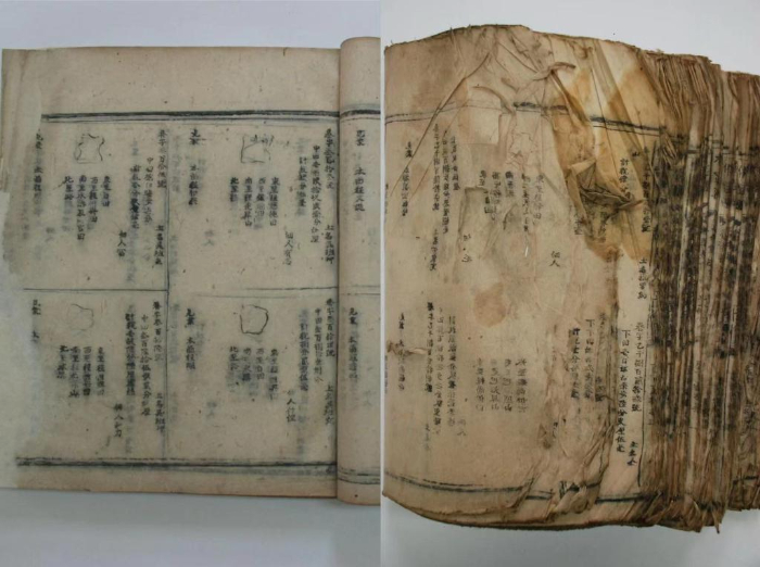 2021年,安徽省圖書館修復(fù)的徽州休寧《魚鱗圖冊》(明萬歷木活字印本)修復(fù)前后對比圖。(安徽省圖書館供圖)