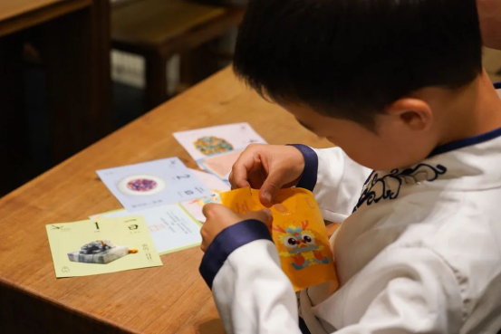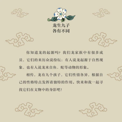 每個龍文物故事上方,也印有當(dāng)天文物的小圖,它周圍伴有一圈半圓打孔的攏線。如意用小手沿著攏線輕輕一摳,一片小小的“龍鱗”就落在了手心。原來,它就是今天的“成長值”啊。