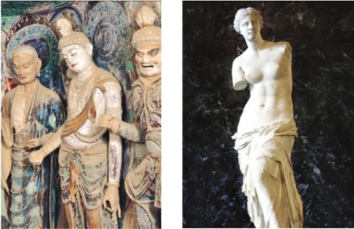 可是,“脅侍菩薩微笑著,在她低垂的眼中可能根本沒有勝負這回事。這種眼神是利他而非個人的……當我們在45窟佛龕前微微俯下身子之時,溫暖的奇跡出現(xiàn)了,她正慈祥地看著你。一位是由堅硬的大理石所雕,另一位是由敦煌本地黏土所塑,維納斯和脅侍菩薩似乎代表了兩種生活態(tài)度。假如她們在盧浮宮中相遇,談?wù)撈鹈?。維納斯可能會唱起女詩人薩福的詩歌:‘你愛的就是美的。這容易解釋。’脅侍菩薩則依然保持微笑,靜靜地看著維納斯”。