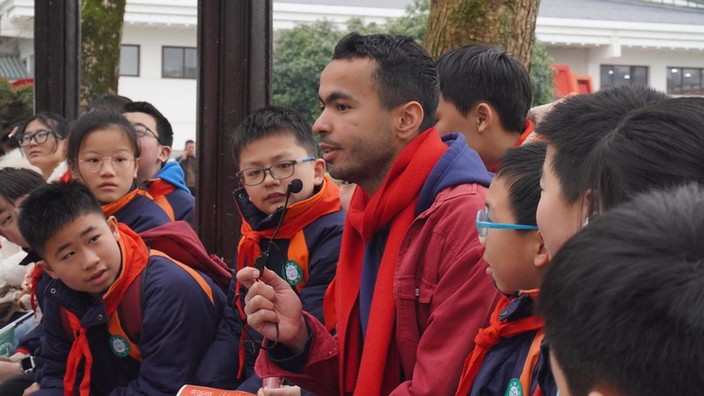走出場(chǎng)館,中外青年圍坐在雷鋒紀(jì)念館外的長(zhǎng)廊暢聊雷鋒精神。在分享初到中國(guó)時(shí)迷路,被身邊一位“活雷鋒”幫助的故事時(shí),來(lái)自阿爾及利亞的留學(xué)生名善深有體會(huì)地說(shuō)到:“真正的善行是發(fā)自?xún)?nèi)心、純粹無(wú)私的。”交流中,不一樣的面孔也吸引了來(lái)自株洲市荷塘小學(xué)小朋友們的關(guān)注,在文化擺渡者志愿服務(wù)隊(duì)的翻譯下,留學(xué)生們與小朋友們打破了語(yǔ)言的壁壘,實(shí)現(xiàn)了關(guān)于雷鋒精神內(nèi)涵的無(wú)障礙交流。