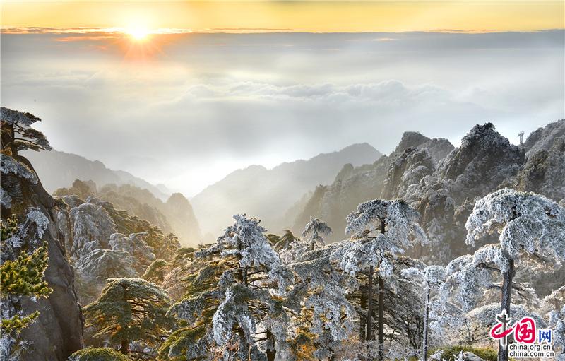 2019年最后一天黃山風景區(qū),出現(xiàn)壯觀的日出、霧凇、云海景觀,到處銀妝素裹,冰雕玉砌,“一夜寒風起,萬樹銀花開”,置身其間,仿佛進入撲朔迷離的童話世界,給來山的游客帶來意外的驚喜。