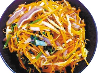 ● 做法:以地產(chǎn)蔬菜胡蘿卜、菠菜和綠豆芽,搭配耳絲、口條、肝片而成,色澤明快、微酸適口:胡蘿卜絲用少許鹽腌至脆柔、綠豆芽焯水保持白嫩、綠菠菜焯過捏去水分切成寸段,這三樣食材搭配營(yíng)養(yǎng)成分暫且不說(shuō),單就紅、白、綠三色,就足夠醒目了。正宗的天水酒碟還要配以鹵豬耳、豬肝和煮熟的拆骨肉,最后點(diǎn)綴以綠綠的香草。