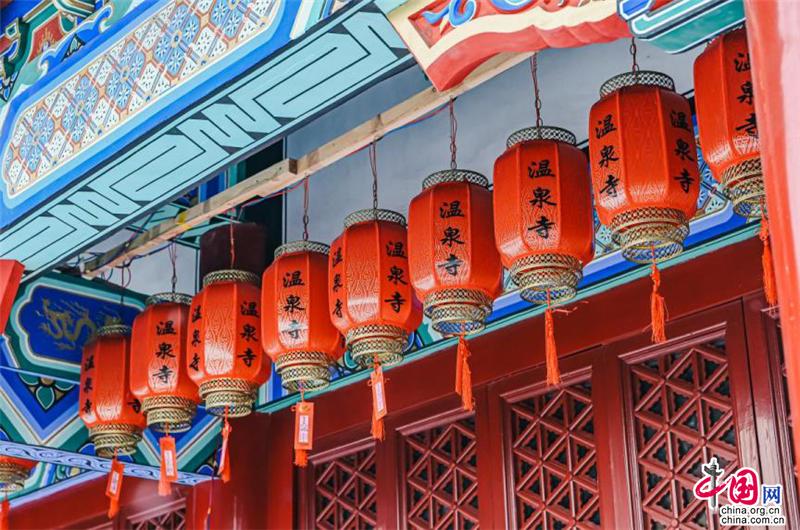 聽說這座寺廟的歷史可以追溯到400多年前,門前的石獅子十分莊嚴(yán),傳遞著佛門圣地的意境。腳踩在雪地上,發(fā)出“嘎吱嘎吱”的聲音;進(jìn)入了廟內(nèi),就能看見白雪覆蓋的木質(zhì)小橋;還有廟宇內(nèi)回廊上精致的鏤空鉤花和印著“溫泉寺”字樣的燈籠。