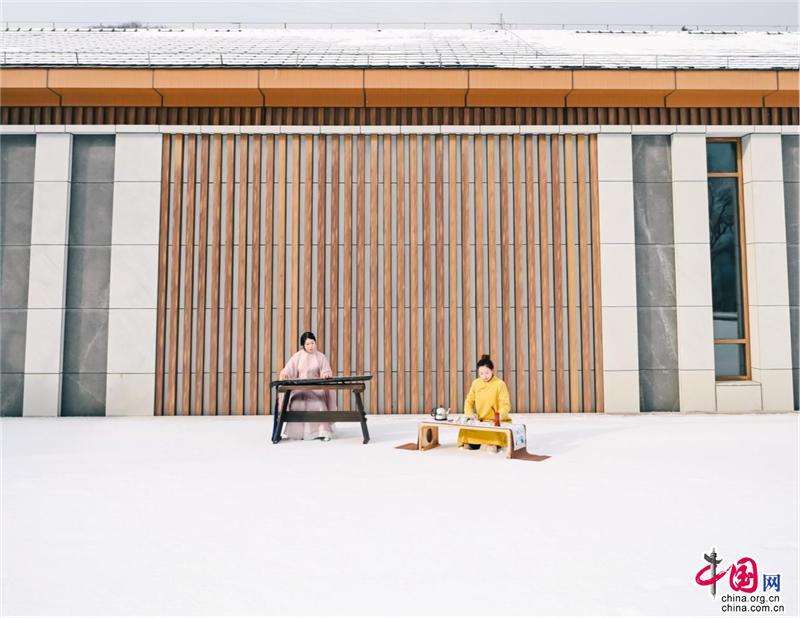 寺廟高處,古榕旁、雪地上,還有另一位古風(fēng)裝束之人在彈奏古箏,聲意蕭瑟。伴隨空靈的山河意境,飄至遠(yuǎn)方。冬季最美的畫面,也不過如此。