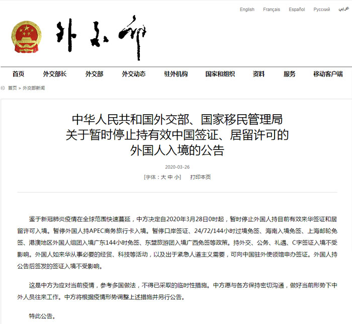 《公告》說,鑒于新冠肺炎疫情在全球范圍快速蔓延,中方?jīng)Q定自2020年3月28日0時起,暫時停止外國人持目前有效來華簽證和居留許可入境;暫停外國人持APEC商務(wù)旅行卡入境;暫??诎逗炞C、24/72/144小時過境免簽、海南入境免簽、上海郵輪免簽、港澳地區(qū)外國人組團(tuán)入境廣東144小時免簽、東盟旅游團(tuán)入境廣西免簽等政策。