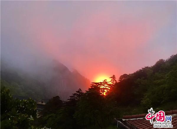 每逢五月,杜鵑花如約而至,用思慮了一冬的巧思把黃山的每一個(gè)角落都裝扮一新,給連綿不絕的山崗披上了五彩的織錦。經(jīng)過(guò)了一冬的蟄伏和等待,杜鵑鉚足了勁兒,花團(tuán)錦簇的熱情如“燃”起的火把,紅透了半邊天。黛青色的遠(yuǎn)山縹緲幽遠(yuǎn),參天的松柏枝繁葉茂,淡而薄的云霧似有還無(wú),杜鵑的姹紫嫣紅給黃山這幅意蘊(yùn)悠長(zhǎng)的水墨畫(huà)增添了幾分濃墨重彩,黃山更加靈動(dòng)秀美了。最壯觀的當(dāng)屬日出日落時(shí)分了,天邊的紅霞好似在花枝間流連,墜入花叢般和散落一地的杜鵑相互輝映、渾然一體。
