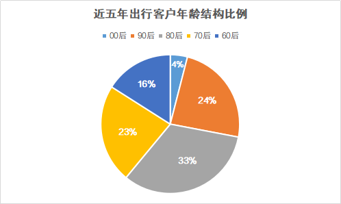 從年齡結(jié)構(gòu)來看,中青旅遨游網(wǎng)近五年訂單數(shù)據(jù)顯示,80和90后年輕家長已成為出行主力軍,80后占比33%,90后占比24%;70后占比23%,60后占比16%。