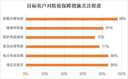 在旅游運營商選擇方面,區(qū)別于以往的“先看價格,再看服務(wù)”,客戶更關(guān)注“是否提供防疫保障,能否有效落實”。九成以上客戶表示,旅游過程中團餐應(yīng)嚴格采用分餐制度,最大化保障用餐安全;八成以上客戶認為,需要嚴控旅游大巴空座率、做好日常消毒工作。