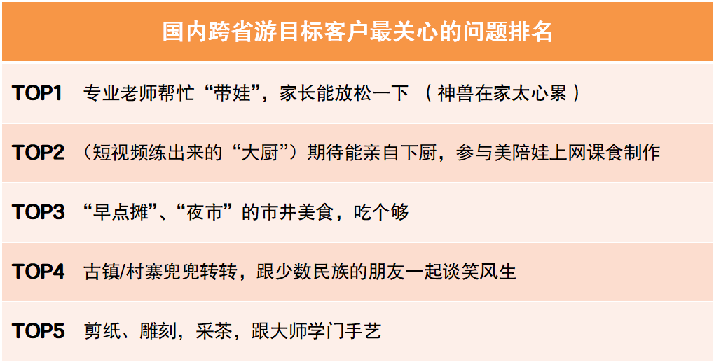 通過針對中青旅遨游網(wǎng)會員、中青旅聯(lián)盟成員單位的忠實客戶等群體的調(diào)研,以及近半年中青旅遨游網(wǎng)搜索、瀏覽的監(jiān)測數(shù)據(jù)進行綜合分析。結(jié)果顯示,西南和西北是客戶喜好程度最高的兩大地域;云南、江蘇、新疆、三亞、陜西是客戶喜好程度最高的五大熱門目的地??蛻糇铌P(guān)心的問題,帶娃、參與、美食、閑逛、學(xué)藝則位列前五名。