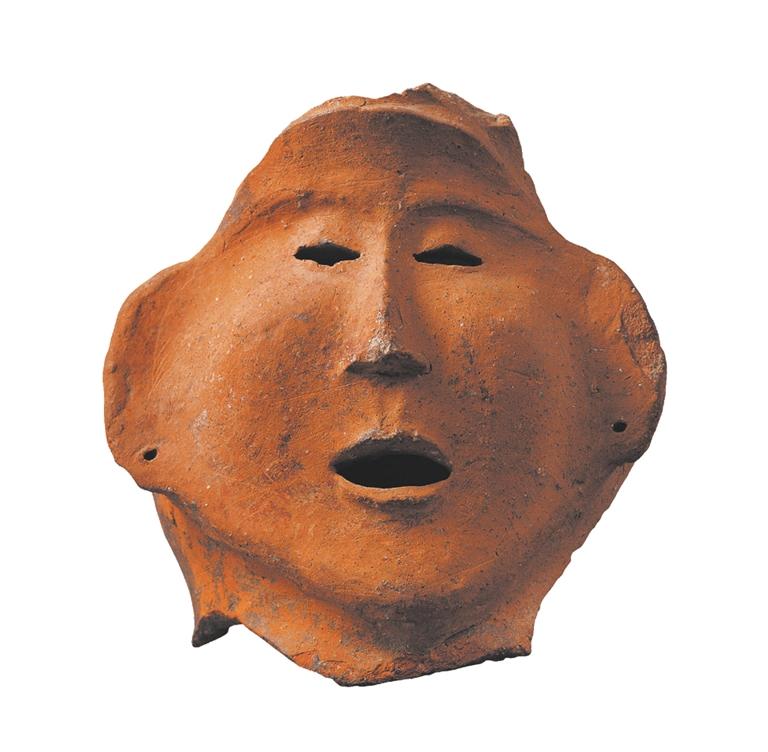 這只“紅陶人面”(距今約5200年)高顴闊面,眉骨微隆,表情呆萌憨厚。彩陶器皿不是碗缽,就是瓶盆,總之都是實(shí)用器皿,只不知這只彩陶人面是做什么用的?也許,是史前哪個小朋友模仿著身邊人的樣子摶著玩的。