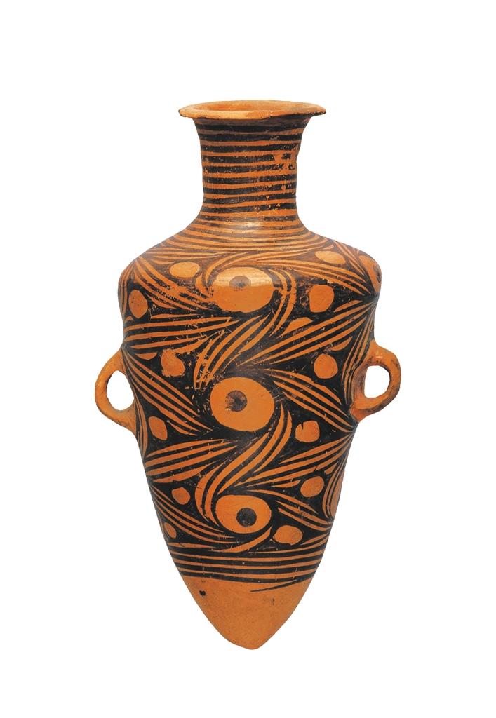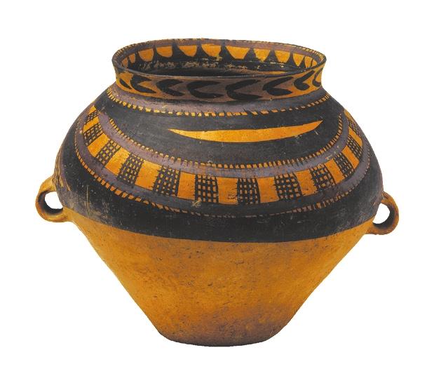 馬家窯文化半山類型(距今約 4500 年),廣河縣地巴坪出土。這是雙耳甕器型大氣貴重,施以紅、黑二彩,紅、黑彩交替使用,腹部繪多層連續(xù)垂弧紋和鋸齒紋,黑、紅彩交替使用,由三組分層連續(xù)的垂弧紋組成整體圖案,每層由兩層黑色帶紋和一層紅色帶紋組成,黑色帶紋上緣繪向上的鋸齒紋。整個圖案密集繁復(fù),俯視猶如一朵盛開的鮮花,造型豐滿,色彩鮮艷。