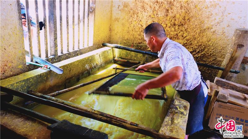 隆回縣灘頭鎮(zhèn)桃林村手工抄紙作坊,已經(jīng)成為一處著名的文旅項(xiàng)目景點(diǎn)。走進(jìn)陶林村,一棟棟青瓦石墻的新屋吸引了人們的目光。屋外山坡竹林茂密,山溪流水潺潺,屋內(nèi)手工抄紙制作的原料、工具布置的次序井然,手工抄紙的全套工藝流程在這幾棟屋中得以完整體現(xiàn)。手工抄紙技術(shù)歷史悠久,始于隋唐,至明朝時(shí)抄紙已經(jīng)非常盛行。上世紀(jì)八十年代鼎盛時(shí)還曾遠(yuǎn)銷東南亞和日本。非遺傳承人李志軍今年61歲,自稱“紙蟲”,帶領(lǐng)著全家人承襲著祖宗留下的獨(dú)特技藝。而支撐著李志軍的堅(jiān)守的,是隆回縣文旅部門的巨大付出和努力。2011年,他們支持李志軍建立了手工抄紙標(biāo)準(zhǔn)化作坊,2016年又對該作坊進(jìn)行擴(kuò)建,使之成為國家級非遺項(xiàng)目。灘頭手工抄紙作坊占地面積1714平方米,是灘頭手工抄紙有史以來最大的作坊,同時(shí)也是集生產(chǎn)、創(chuàng)新、傳承、展示、研學(xué)為一體的重要基地和文旅基地。