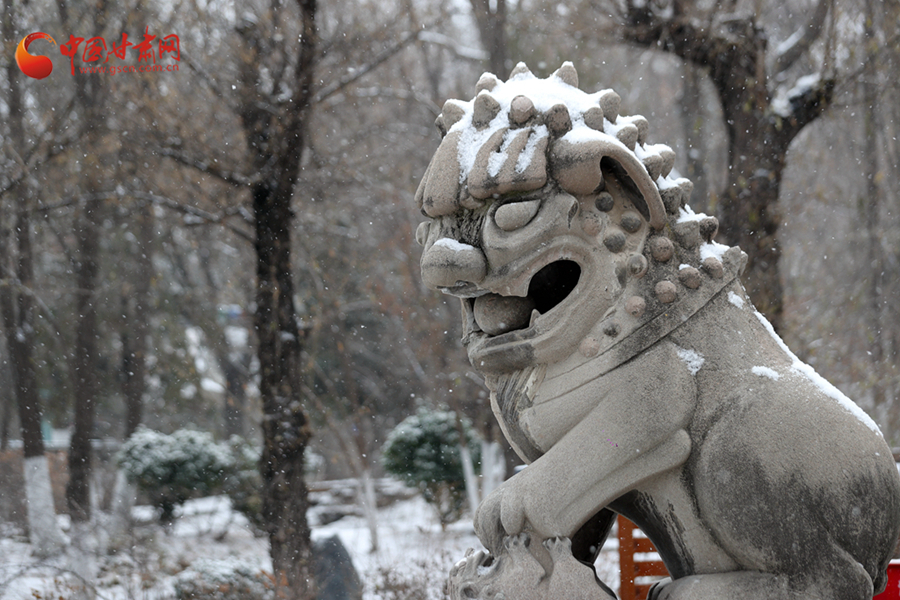 雪中的石獅在威嚴(yán)中多了幾分俏皮