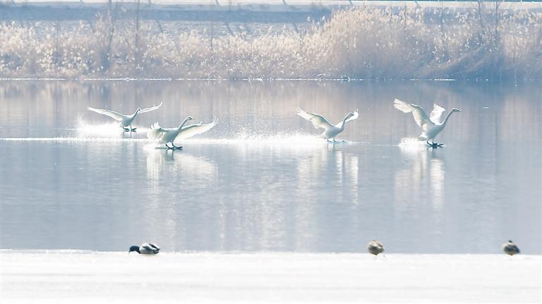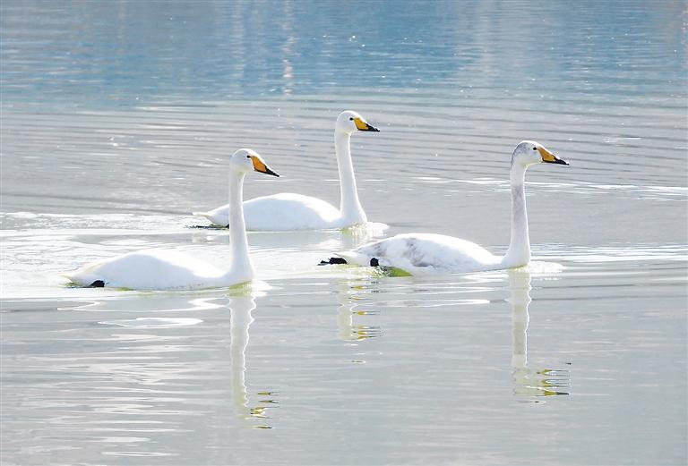 近日,永靖縣鹽鍋峽鎮(zhèn)境內(nèi)的黃河八盤(pán)峽水庫(kù)成為天鵝等候鳥(niǎo)越冬的樂(lè)園,它們?cè)诖藯?、覓食,成為冬日黃河里的一道靚麗風(fēng)景。 本報(bào)記者 史有東 攝