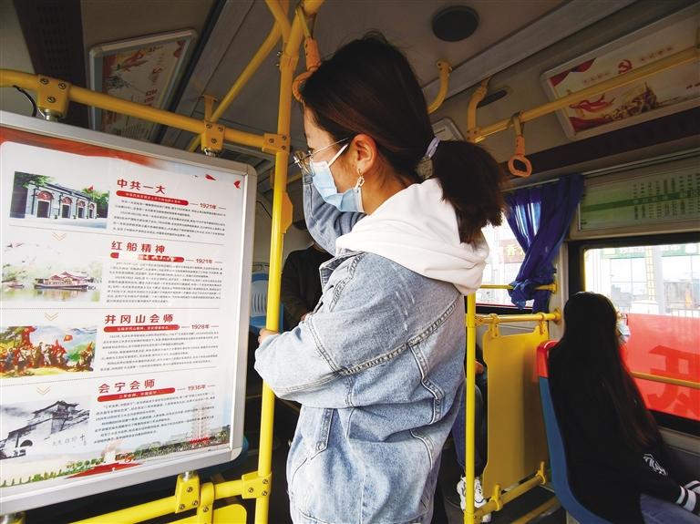 黨史學(xué)習(xí)教育主題車廂的車體外部掛有醒目的黨史宣傳標(biāo)語,走進(jìn)車廂,風(fēng)道展板上以黨史故事的形式,圖文并茂、生動(dòng)形象地展示著紅船精神、井岡山精神、長(zhǎng)征精神、遵義會(huì)議精神、延安精神、西柏坡精神、抗美援朝精神、戰(zhàn)疫精神等內(nèi)容。車廂內(nèi)的座椅靠背、宣傳欄等處也印有不同的黨史宣傳知識(shí),公交車廂成了黨史學(xué)習(xí)教育的流動(dòng)“微課堂”。乘坐在黨史學(xué)習(xí)教育主題公交車上,乘客便可重溫中國(guó)共產(chǎn)黨波瀾壯闊的輝煌歷程,汲取民族復(fù)興的精神力量。