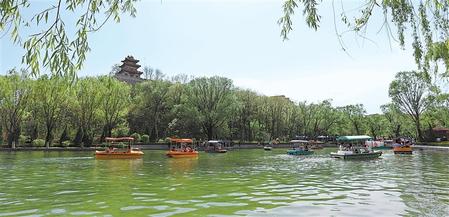 5月1日,游客在平?jīng)鍪辛珗@泛舟,享受假日美好時光。新甘肅·甘肅日報通訊員 吳希會