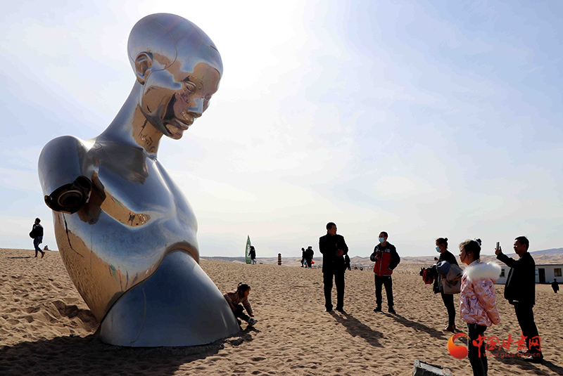 春節(jié)期間,甘肅省民勤縣蘇武沙漠雕塑藝術(shù)主題公園117件不同材質(zhì)、不同風(fēng)格的雕塑藝術(shù)佳作,高聳在靜謐的蒼穹之下,在茫茫沙漠中,與藍(lán)天白云相映成趣,盛迎四海賓朋前來(lái)觀光旅游,讓孤寂的沙漠,成為了熱門(mén)的“打卡地”。